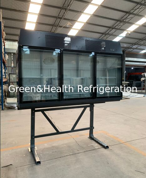 یخچال ترکیبی تجاری. درب شیشه ای عمودی یکپارچه و صفحه نمایش قفسه ای جزیره ای. سیستم پلاگین R290.